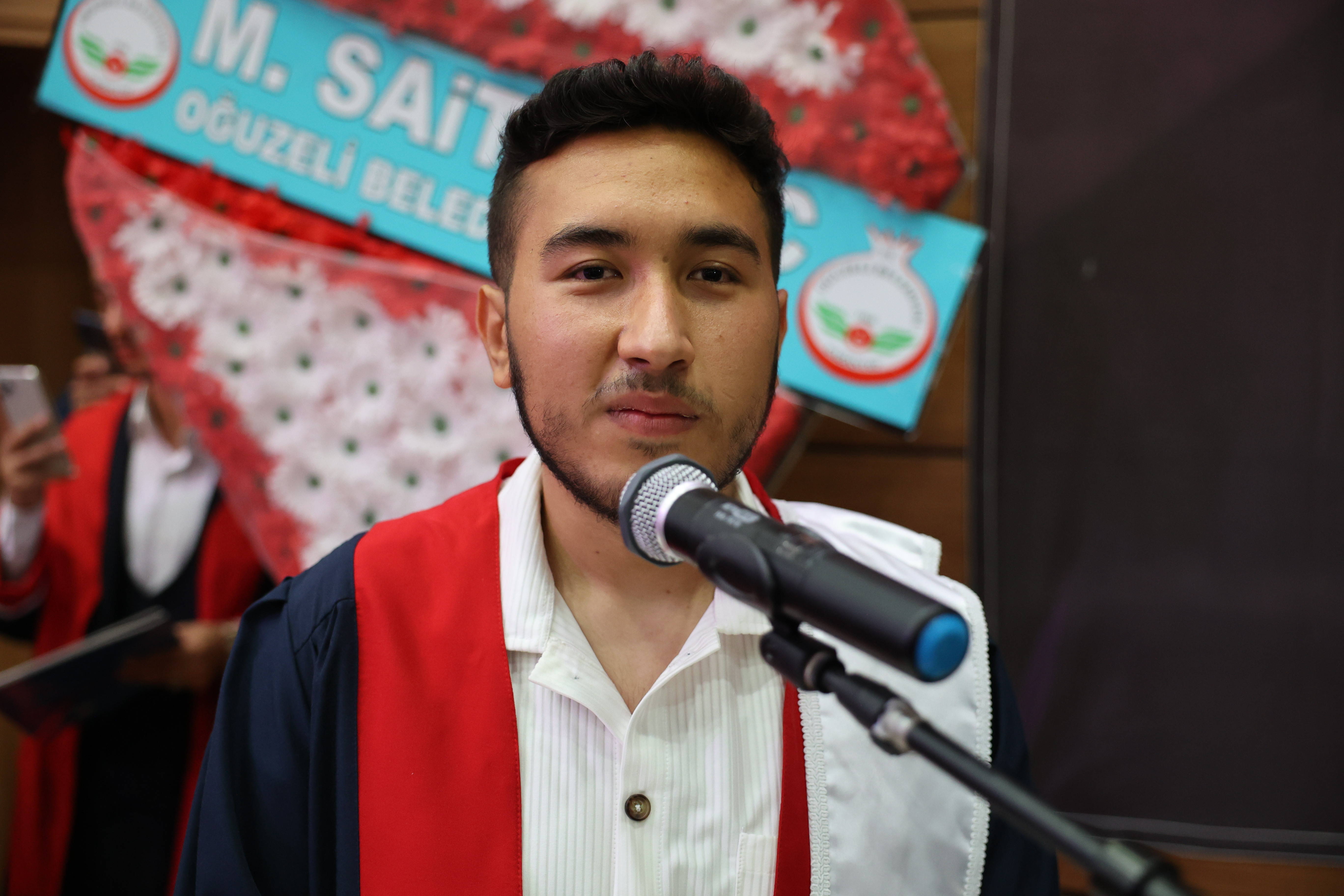 Mezunlar adına konuşan Yüksekokul Birincisi Mert Aslan da Gaziantep Üniversitesi Oğuzeli Meslek Yüksekokulu’ndan gururla mezun olduğunu belirterek şunları söyledi: “Bugün hak ettiğimiz diplomalar bize aynı zamanda çok önemli sorumluluklar yüklüyor. Ülkem ve güneşin altındaki tüm insanlık için her ne iş yapıyorsak elimizden gelenin en iyisini yapmaya çalışacağız” dedi.
