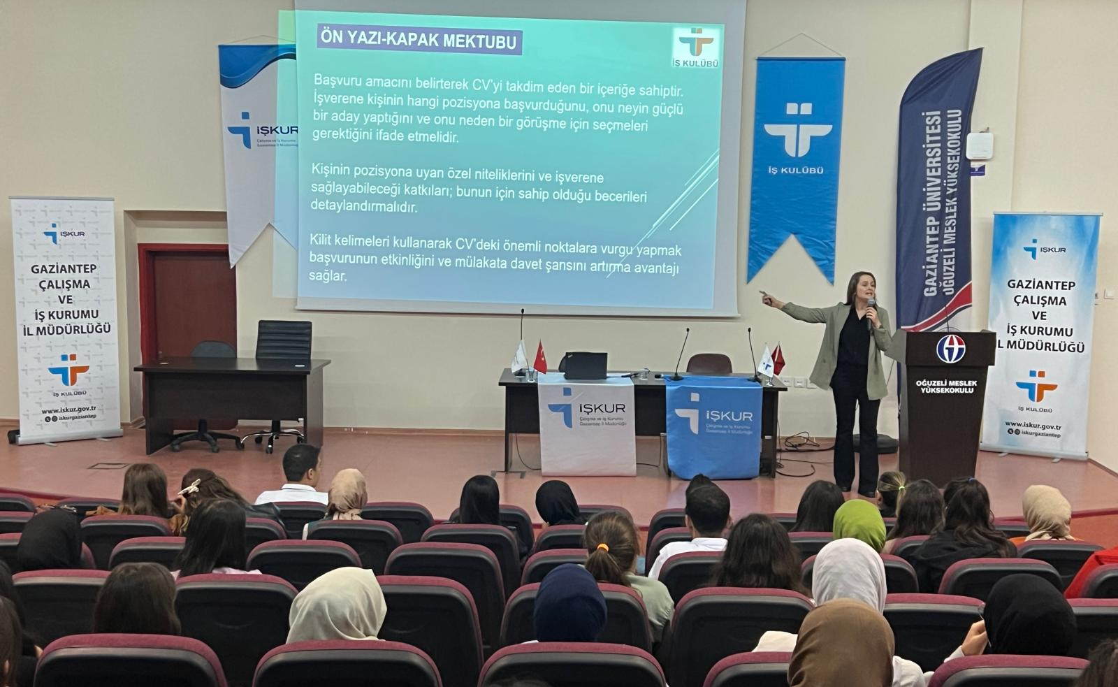 GAÜN Kariyer Merkezi tarafından organize edilen, Oğuzeli Meslek Yüksekokulu Seminer Salonunda gerçekleşen etkinlikte, öğrencilere etkili iş arama becerileri, CV hazırlama ile mülakat teknikleri, beden dili ve etkili iletişim yöntemleri konularında bilgilendirme yapıldı. Seminerde, iş dünyasında başarıya ulaşmak için gerekli olan beceriler üzerine önemli bilgiler verilirken, beden dili ve etkili iletişim yöntemlerinin iş görüşmelerindeki önemi vurgulandı. Hande Berhumoğlu CV hazırlarken dikkat edilmesi gereken noktalar ve mülakat sürecinde başarılı olmanın ipuçlarını paylaştı.